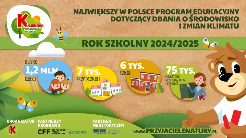 „Kubusiowi Przyjaciele Natury” to największy ogólnopolski program edukacyjny o ekologii skierowany do dzieci w wieku przedszkolnym i wczesnoszkolnym. Organizowany jest przez markę Kubuś we współpracy z ekspertami. Materiały do lekcji dla najmłodszych powstały we współpracy z UNEP/GRID-Warszawa.  W programie wzięło udział już ponad 10 milionów dzieci w całej Polsce. Uczniowie i przedszkolaki uczestniczą w zajęciach tematycznych, które pomagają im zrozumieć, jak dbać o środowisko, wprowadzają w podstawy ekologii, zachęcają do jedzenia owoców i warzyw oraz pokazują, jakie znaczenie dla zdrowia ma aktywność fizyczna. Kolejna edycja startuje już we wrześniu. Więcej informcji: https://przyjacielenatury.pl/.